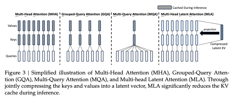 During inference, MLA only needs to cache , so its KV cache has only elements, where denotes the number of layers. This method of compression is conceptually similar to LoRA, which is used for fine-tuning.