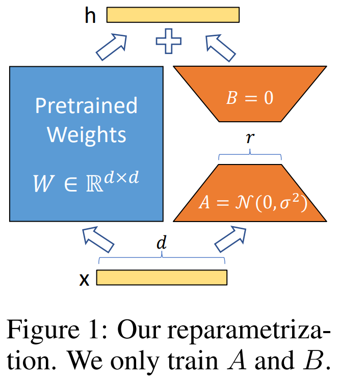 When adapting to a specific task, pre-trained language models have low “intrinsic dimension” and can still learn efficiently despite a random projection to a smaller subspace. LoRA exploits this by freezing the pre-trained weights and injects trainable rank decomposition matrices into each layer of the Transformer architecture, as shown in Figure 1 from the paper:
